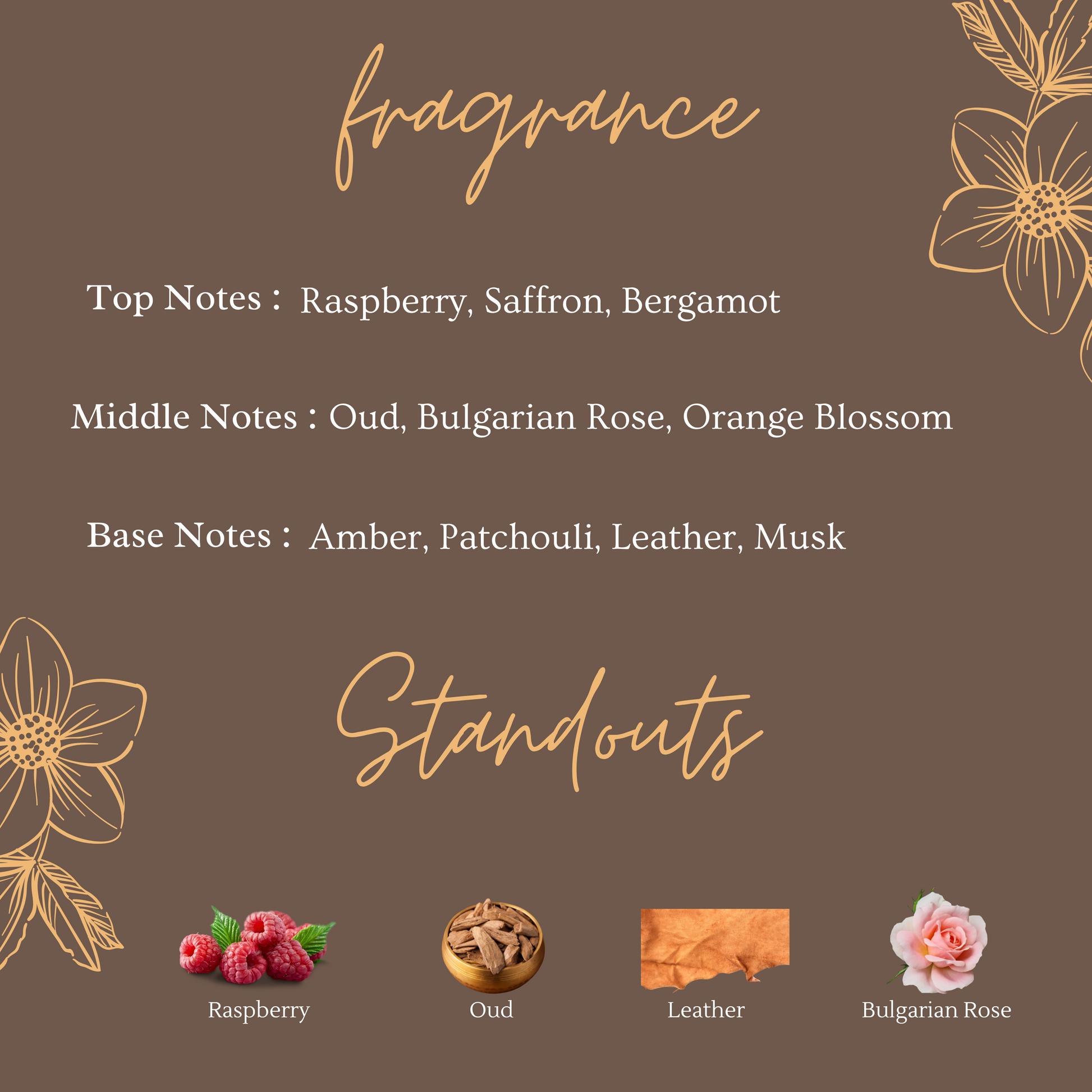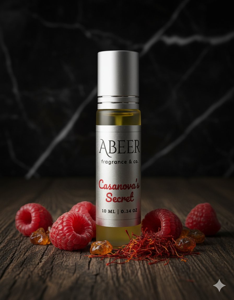 Description: Casanova's Secret is a luxurious and magnetic fragrance that embodies sensuality and mystery. The scent opens with the exotic sweetness of ripe raspberry and the golden warmth of saffron, instantly captivating the senses. As it deepens, the heart unveils a rich tapestry of smoky oud, opulent rose, and delicate orange blossom, evoking a sense of timeless sophistication. The base is an irresistible blend of amber, patchouli, and leather, leaving a smooth, velvety trail that lingers in the air like an unforgettable secret.